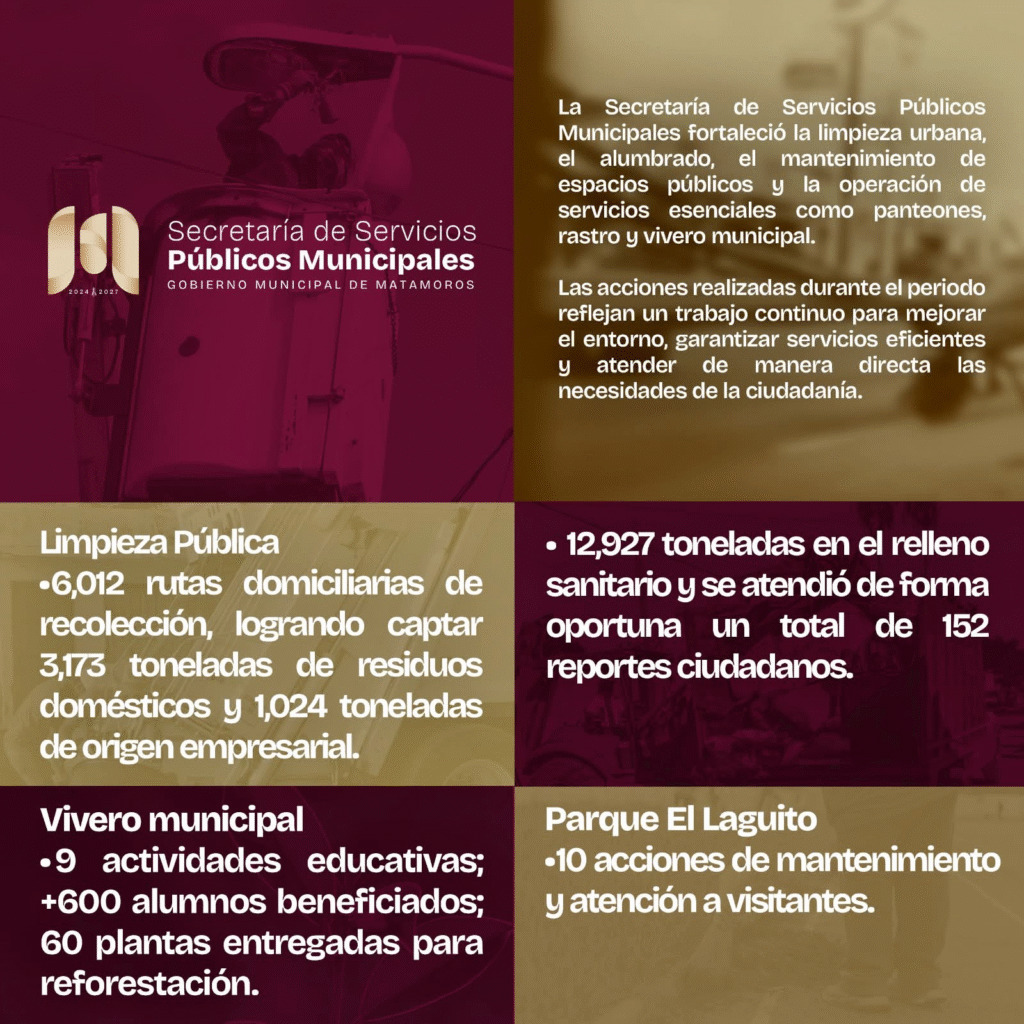 H. Matamoros, Tamaulipas.- Durante este periodo, la Secretaría de Servicios Públicos Municipales, en coordinación con el alcalde de Matamoros Beto Granados, realizó acciones continuas para fortalecer la limpieza urbana, el mantenimiento de espacios públicos y la operación eficiente de los servicios esenciales en la ciudad.