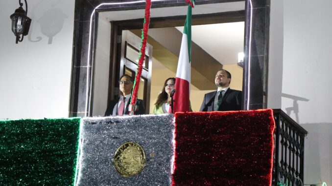La presidenta municipal, acompañada de síndicos y regidores, recibió el lábaro patrio de manos de la escolta del CETis 129 para posteriormente realizar la arenga que unió a la multitud en un solo grito: ¡Viva México!