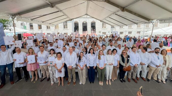 La Presidenta Municipal de Tampico, Mónica Villarreal Anaya, encabezó la ceremonia de entrega de los Distintivos “Hecho en Tampico” a 70 empresarios locales, reafirmando el compromiso de su administración con el fortalecimiento del comercio y la economía regional.