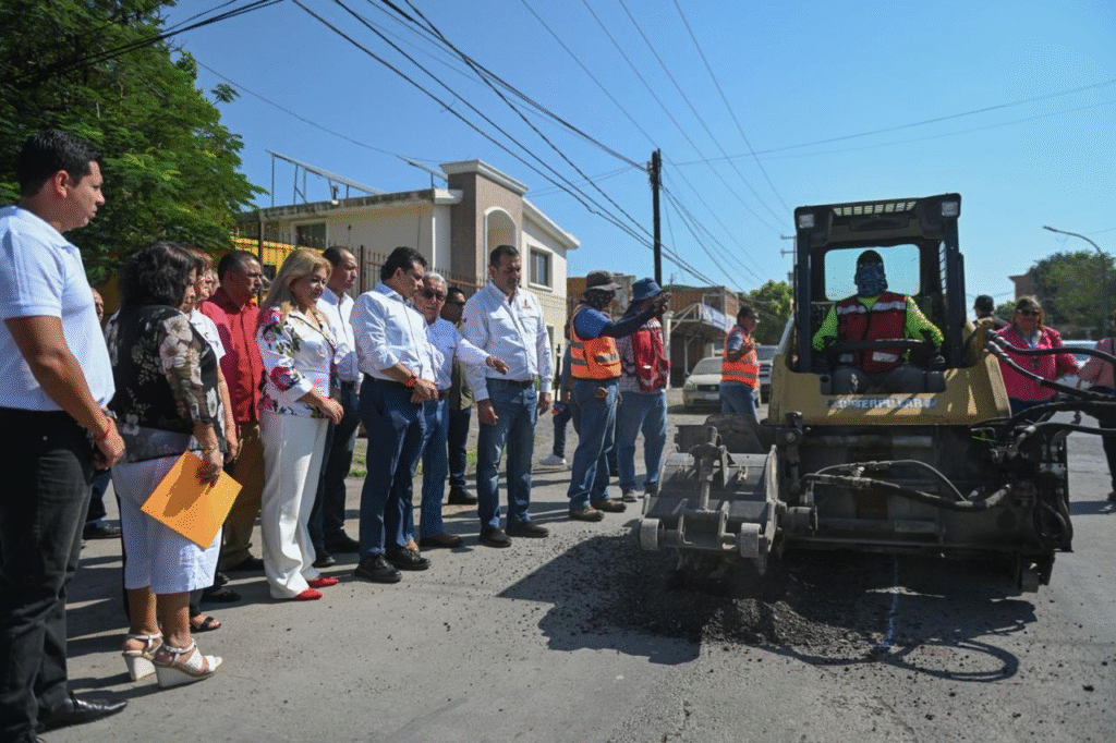 Directivos del Jardín de Niños “Ma. Teresa Treviño García”, primaria República de Chile, supervisión Zona 1 Sector 2 de Preescolar y Sección 30 del SNTE, acompañaron al alcalde Eduardo Gattás Báez al inicio de la rehabilitación de asfalto dañado por las lluvias.