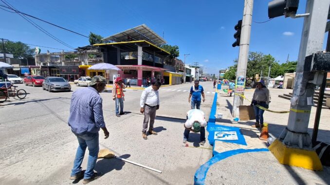 Por instrucciones de la Presidenta Municipal, Patty Chío, personal de la Dirección de Servicios Públicos se realizan trabajos de pintado y remarcado de señaléticas viales en calles del primer cuadro de la ciudad. Las labores incluyen la delimitación de áreas de acotamiento, pasos peatonales en esquinas y espacios exclusivos para personas con discapacidad.
