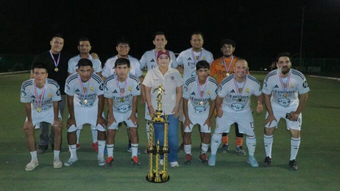San Fernando, Tam.- La presidenta municipal Verónica Aguirre encabezó la ceremonia de premiación del Torneo de Copa de la Liga Municipal de Fútbol 7, que llevó su nombre, donde se reconoció al equipo Gorilas Gym como campeón del torneo y al Deportivo Feli como subcampeón.