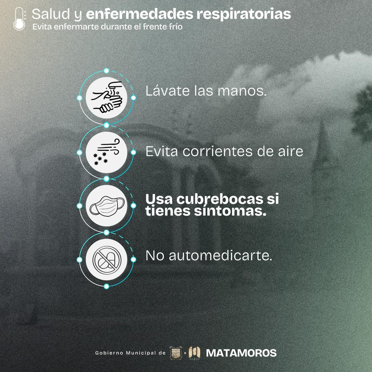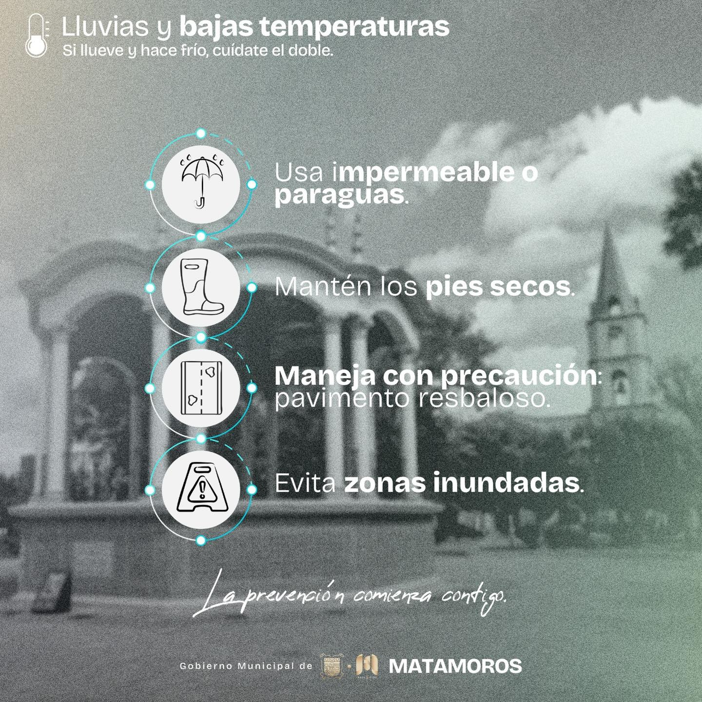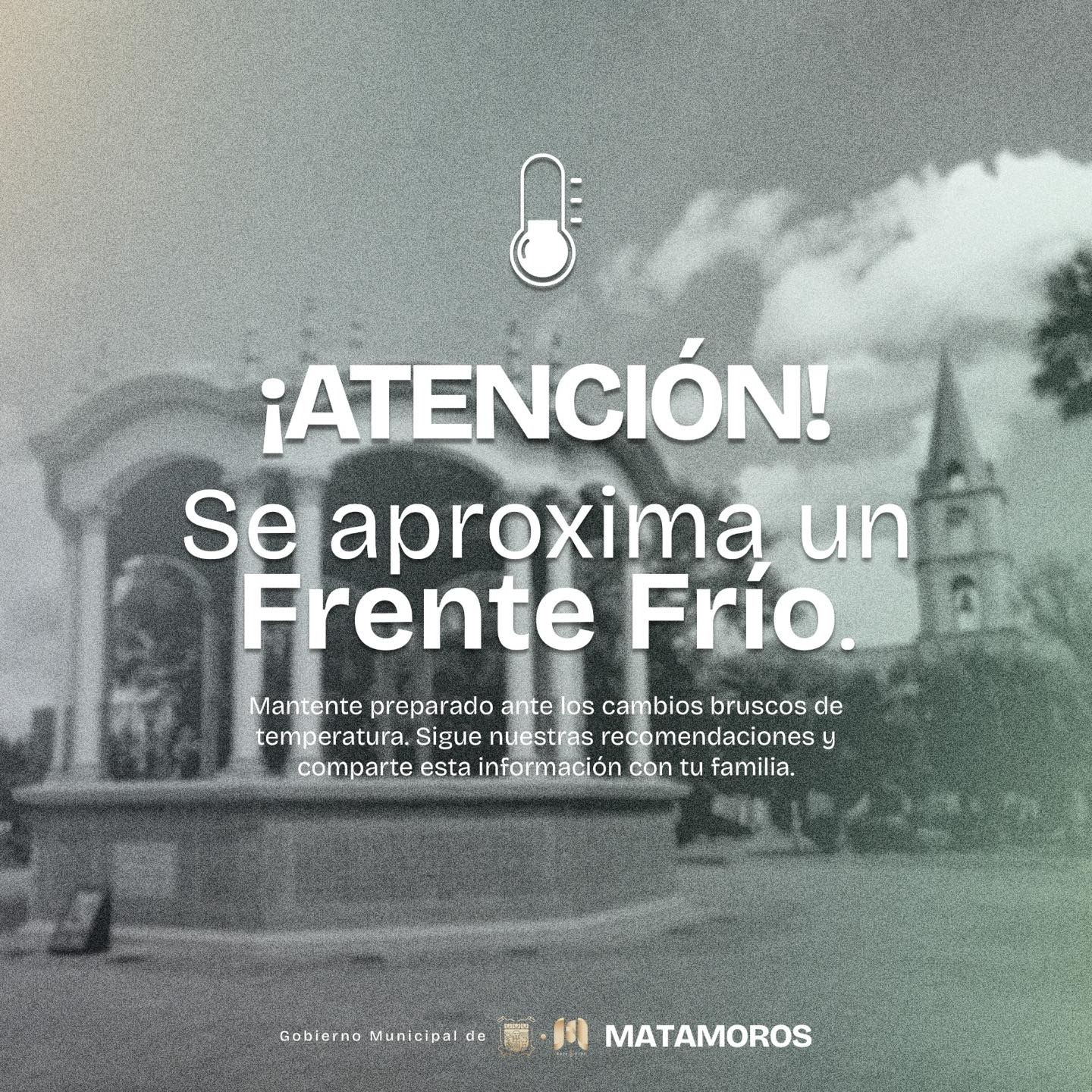 El gobierno de Matamoros que preside el alcalde Beto Granados, pensando siempre en el bienestar e integridad de los ciudadanos, informa que a través de la Dirección de Protección Civil se mantendrá una estrecha vigilancia de las condiciones del clima, ya que hay un pronóstico de bajas temperaturas. De igual forma por instrucciones del Presidente Municipal, se mantendrán atentos para de ser necesario abrir los refugios AGRADECEMOS LA DIFUSIÓN DE LAS MEDIDAS DE PREVENCIÓN QUE ACONTINUACIÓN LES ENVÍAMOS COMO INFOGRAFÍAS.