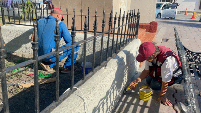 Ante la proximidad de los festejos por el 277 aniversario de la fundación de San Fernando, personal del área lleva a cabo labores de limpieza general y pintura en la plaza principal, atendiendo bancas, kiosco, cordones, jardineras y áreas aledañas.
