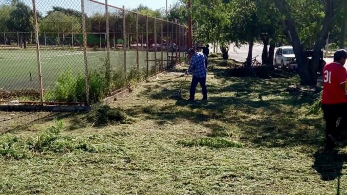 SAN FERNANDO, TAM.- El Gobierno Municipal, encabezado por la presidenta Verónica Aguirre, a través del Departamento de Parques y Jardines, lleva a cabo trabajos de limpieza y poda de pasto en el campo sintético de la colonia Jardín.