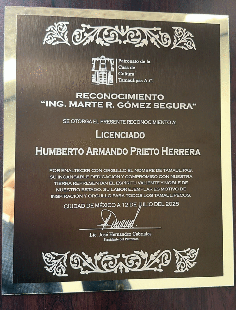 Este sábado 12 de julio, el presidente de la Junta de Gobierno del Congreso Libre y Soberano de Tamaulipas, Humberto Prieto Herrera, junto a su esposa Verónica Garza, recibió el reconocimiento “Ing. Marte R. Gómez Segura” por parte del Patronato de la Casa de Cultura Tamaulipas.