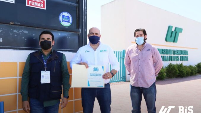 Reynosa, Tamaulipas.- El Comité Estatal de Seguridad en Salud, a través de la  Comisión Estatal para la Protección contra Riesgos Sanitarios (COEPRIS), hizo entrega del distintivo y sello de Escuela Segura a la Universidad Tecnológica de Tamaulipas Norte (UTTN), que dirige el Rector Edgar Garza Hernández.