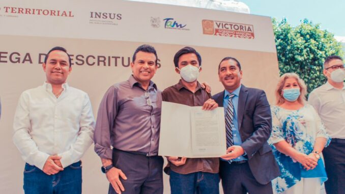 En la explanada de la presidencia municipal de Victoria el alcalde Eduardo Gattás Báez y el Director General del Instituto Nacional del Suelo Sustentable José Alfonso Iracheta Carroll encabezaron la entrega de los títulos de propiedad a las familias que habitan en; La Montaña, Santa Clara, La Presa 1 y 7 de Noviembre.