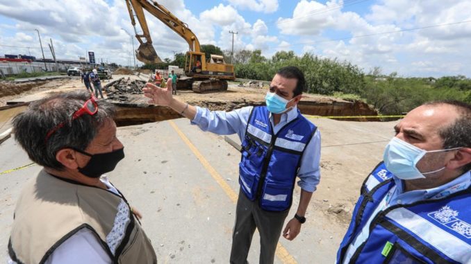 Presidente Municipal Enrique Rivas recorre el lugar afectado y dice que estará cerrado por 2 meses y medio y se buscará solución de fondo en área dañada, entre Carretera Nacional y Prolongación Monterrey