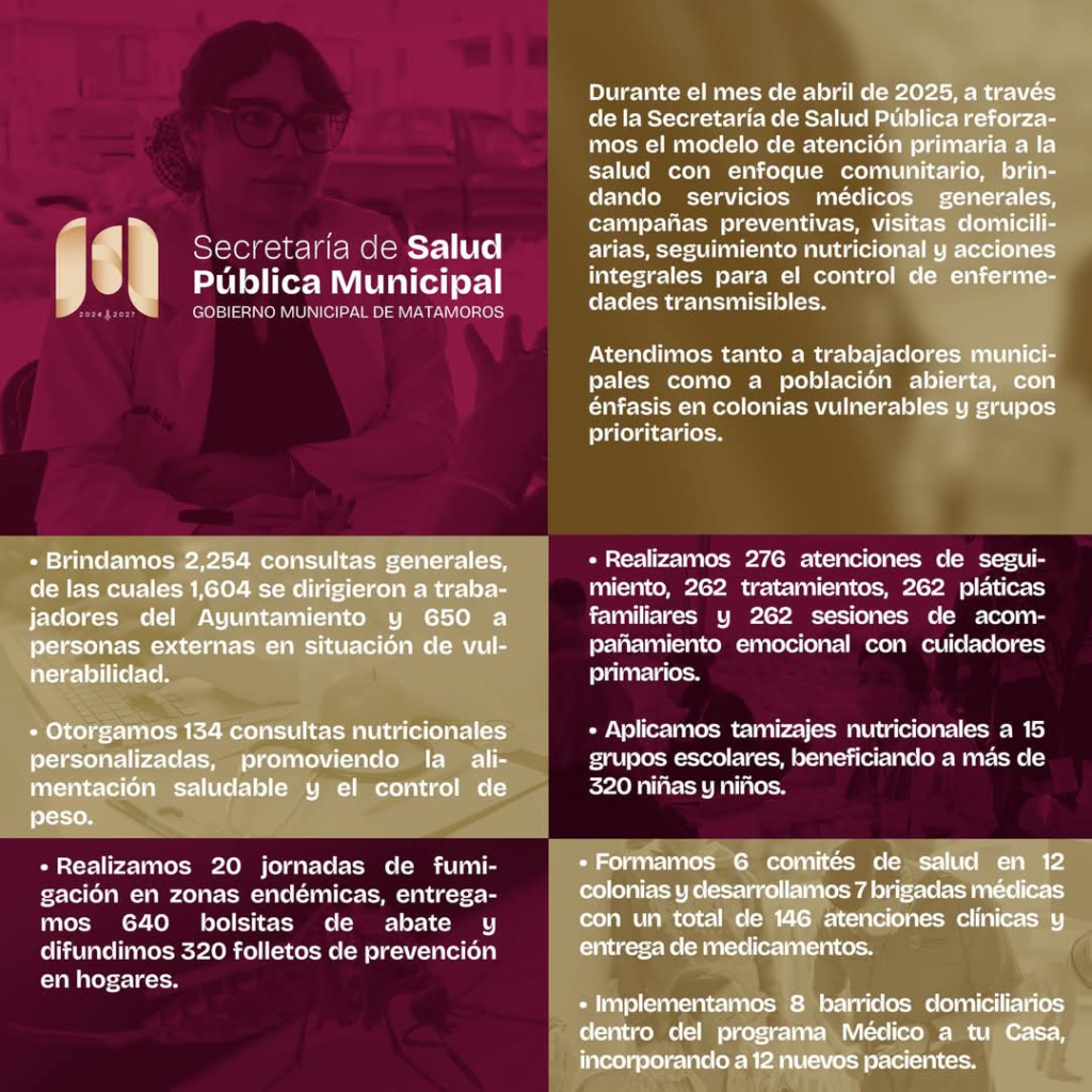 H. Matamoros, Tamaulipas.- El Gobierno de Matamoros, que preside Beto Granados, informó que la Secretaría de Salud Pública Municipal reforzó en abril su modelo de atención primaria con enfoque comunitario. Esta estrategia busca acercar servicios médicos, nutricionales y preventivos a la población, priorizando a los trabajadores del Ayuntamiento y a aquellos que se encuentran en situación vulnerable.