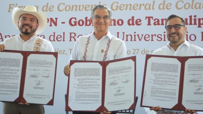 González, Tamaulipas. – El gobernador Américo Villarreal Anaya firmó el convenio de colaboración con el Instituto Politécnico Nacional e inauguró el Recinto Universitario Polivirtual, una nueva plataforma académica con la calidad y la excelencia educativa que distingue a esta prestigiada institución y que, por primera vez, se pone en marcha en todo el país.
