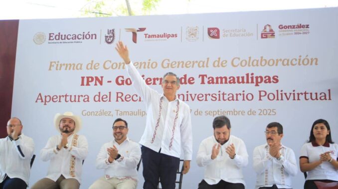 González, Tamaulipas. – El gobernador Américo Villarreal Anaya firmó el convenio de colaboración con el Instituto Politécnico Nacional e inauguró el Recinto Universitario Polivirtual, una nueva plataforma académica con la calidad y la excelencia educativa que distingue a esta prestigiada institución y que, por primera vez, se pone en marcha en todo el país.