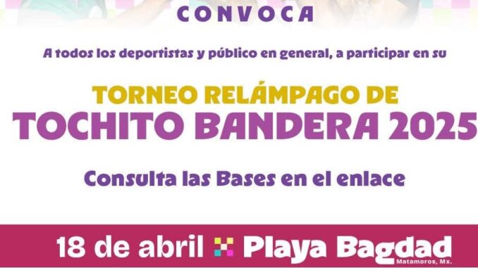 La invitación es para todos los deportistas y público en general en el torneo relámpago de tochito bandera 2025, a realizarse el próximo 18 de abril en la playa Bagdad de Matamoros dentro de la programación del Festival del mar 2025.
