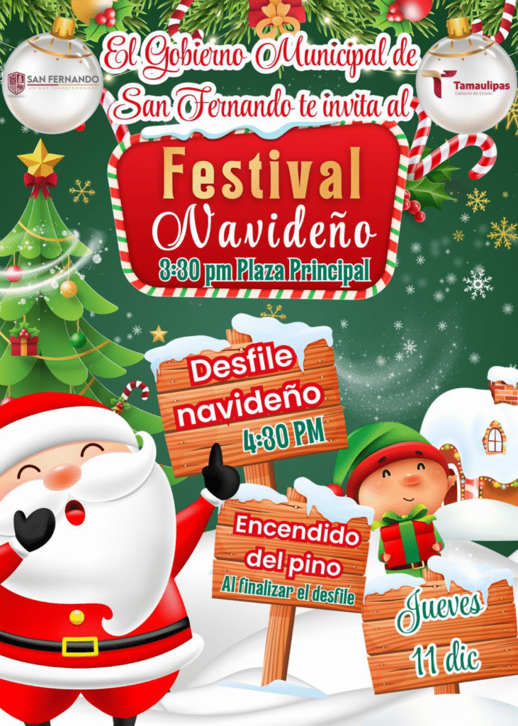 San Fernando, Tamaulipas.- Este jueves 11 de diciembre a partir de las 3:30 p.m. te esperamos en la Plaza Principal para disfrutar de un ambiente lleno de magia, música y alegría.