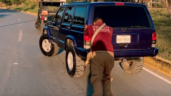 H. Matamoros, Tamaulipas.- Elementos de la Vigilancia Turística, adscritos a la Secretaría de Seguridad Pública Municipal, brindaron apoyo oportuno a un conductor que sufrió fallas mecánicas en su vehículo. Gracias a su pronta actuación, se garantizó la seguridad del automovilista, así como la de los demás conductores y peatones que transitaban por la zona.